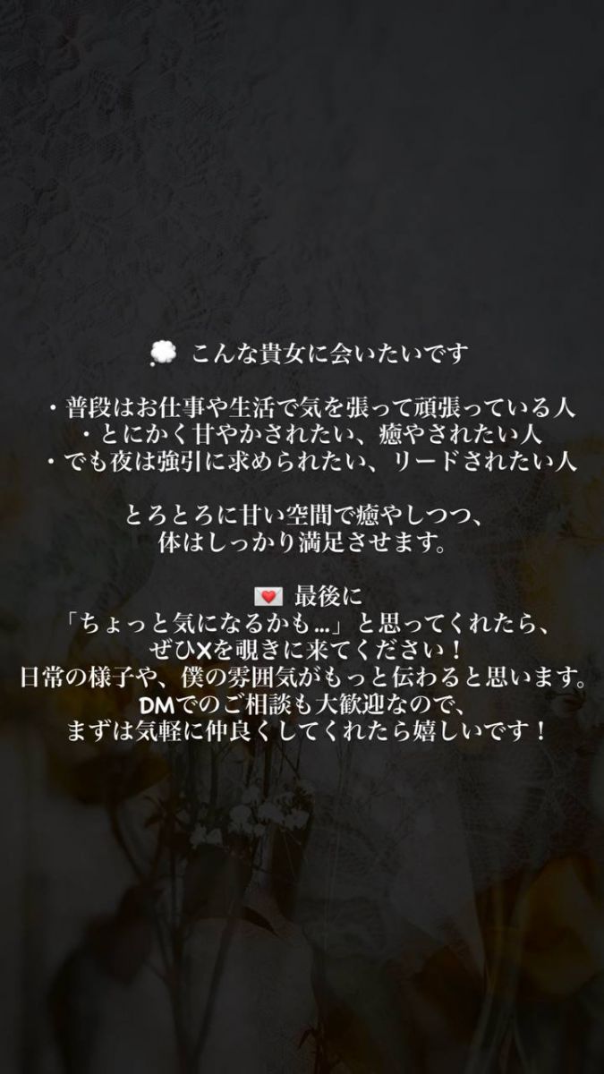 会う前まですごく緊張して不安いっぱいでしたが、優しい声かけや返事、自然なスキンシップに安心できたしリラックスできたし、カウンセリングも丁寧で、気遣いも素敵でした。