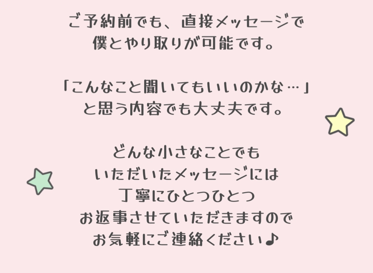 いつもDMでお話してくれて、私の相談にもちゃんと答えてくれるセラピストさんです。お会いしてもDMの時と同じく優しく対応してくれて楽しくて幸せな時間を過ごさせてもらってます。