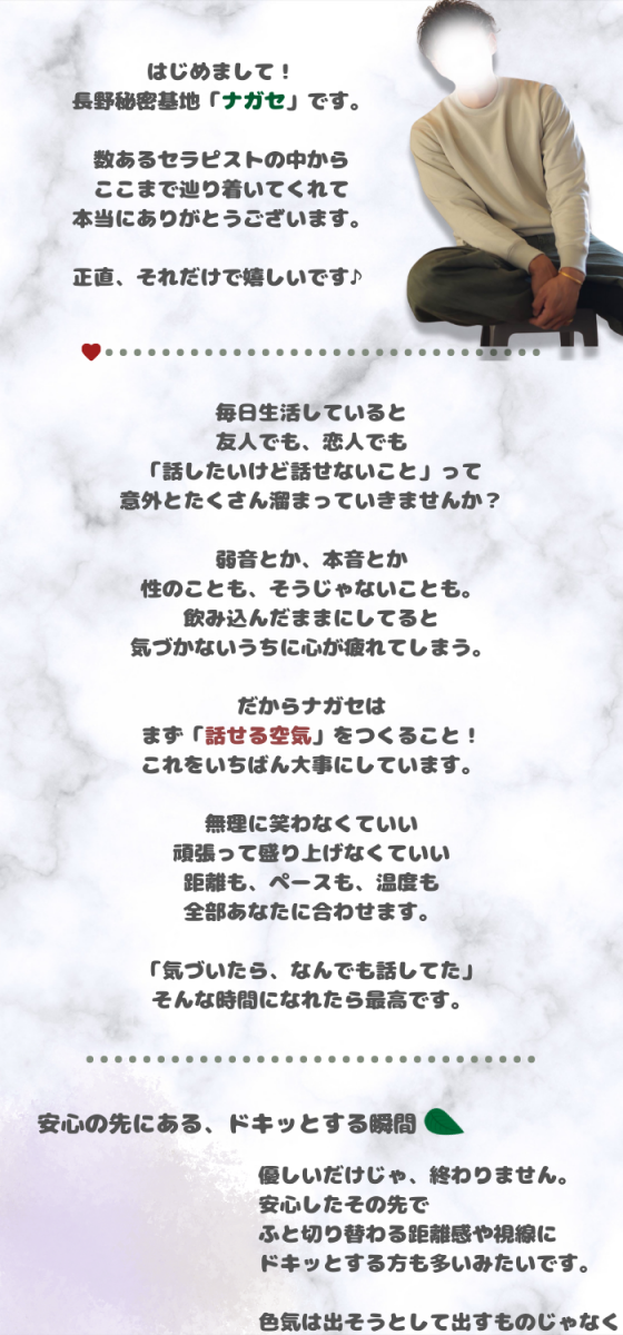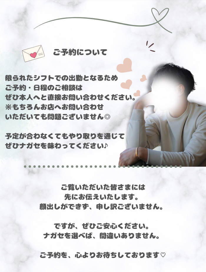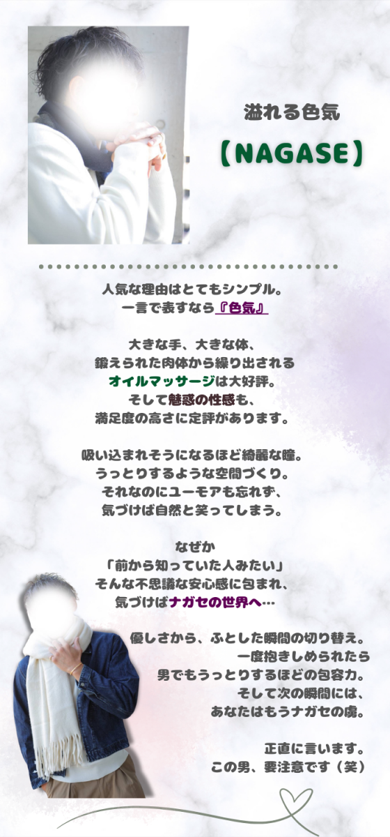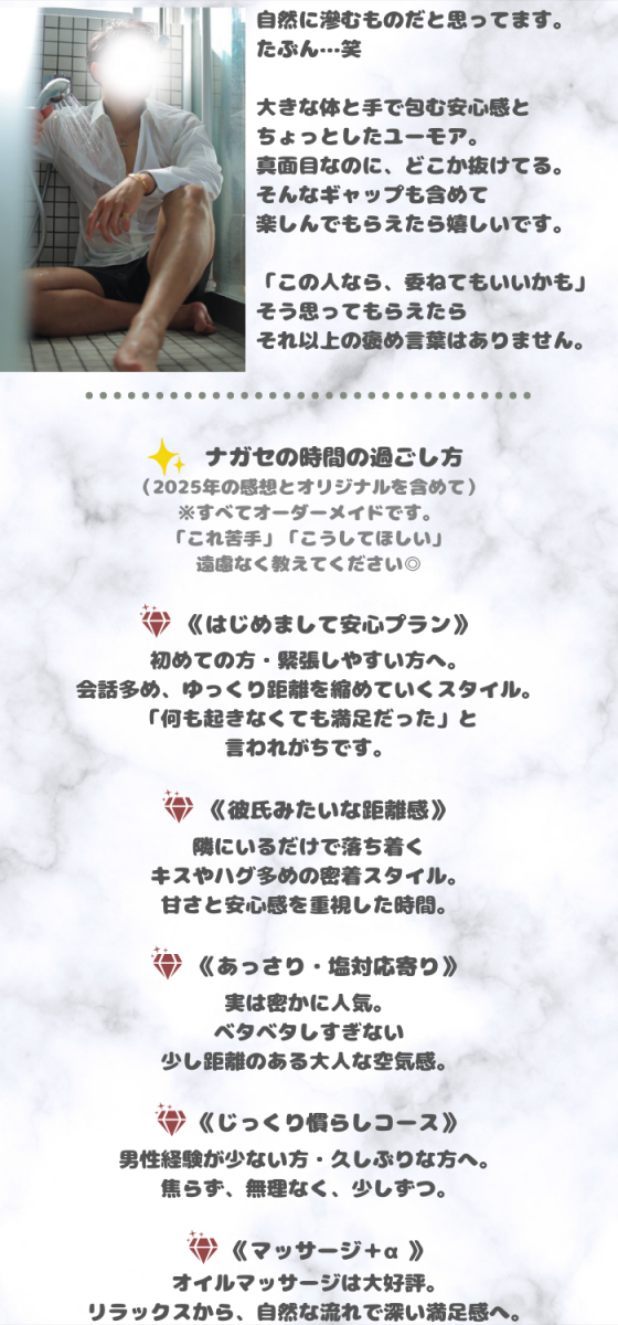 ずっと他店を利用していましたが気分を変えたくてナガセさんを指名させていただきました️長身且つイケメンでいかにもスポーツやってます!って感じのガッチリ体型♡体を洗ってもらうことはよくあるけど、ナガセさんの泡洗体は気持ちよすぎてやばいので一度体験してほしいです大きな手でされるオイルマッサージも格別でした施術に入る前の流れや施術中の雰囲気が個人的にめちゃくちゃ好きだし、やってくれること全部気持ちいし上手いですナガセさんのお陰で初めて自分のここが気持ちいんだ!っていうポイントが分かって嬉しかったです️長くなりましたがまた指名したいと思える人なので迷われている方ぜひ♡