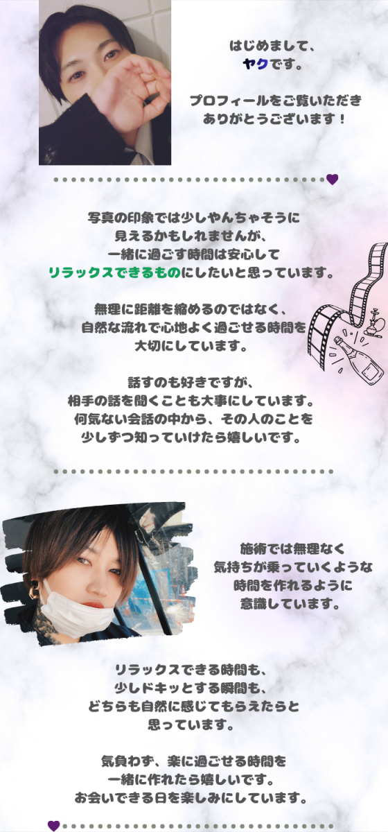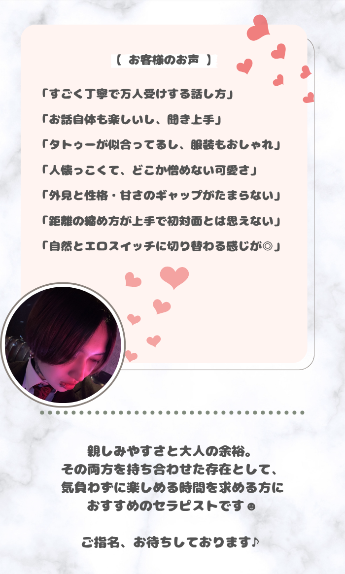 ※ご希望があれば恋人プレイ等も可能ですので男性セラピストにお申し付け下さい。