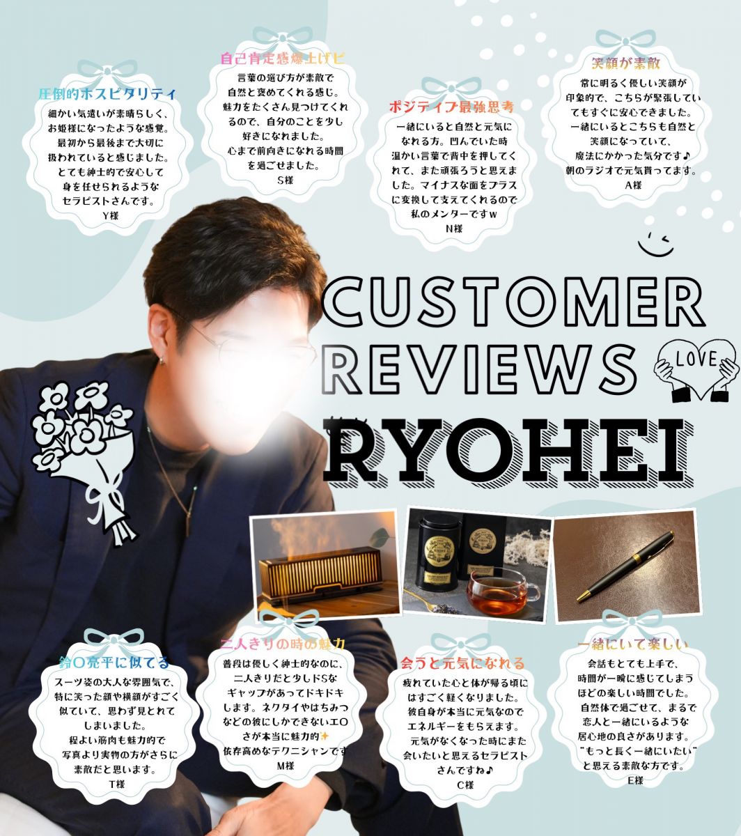 本当に身も心も疲れてしまっていたのですが、りょうへいさんの優しさと笑顔そして温かさを感じて自分自身にちゃんと向き合えた気がします( ; ; )